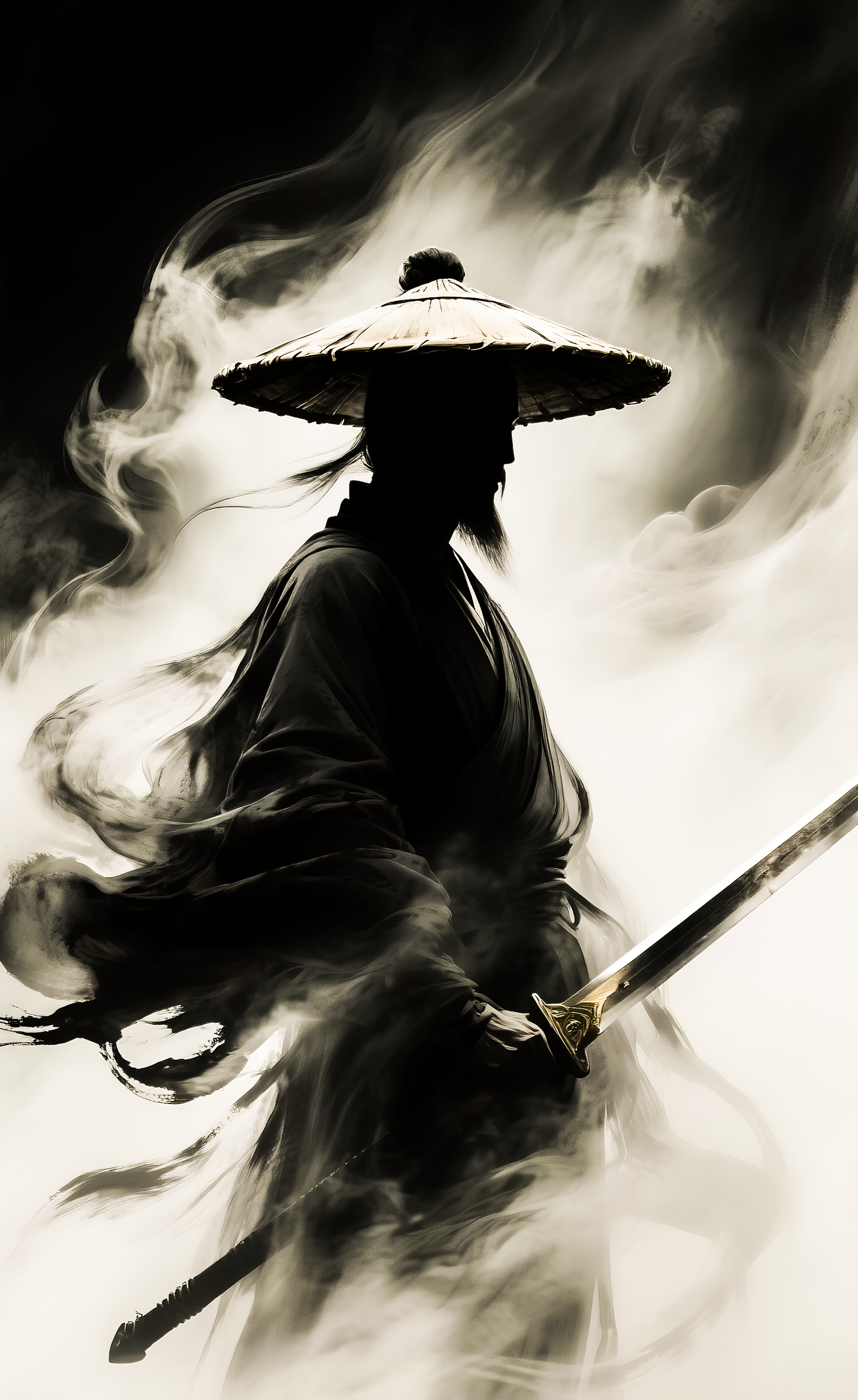 极简主义风格水墨画,黑灰色水雾盘旋,融合古代剑客宗师轮廓,头戴斗笠,高分辨率,动....png