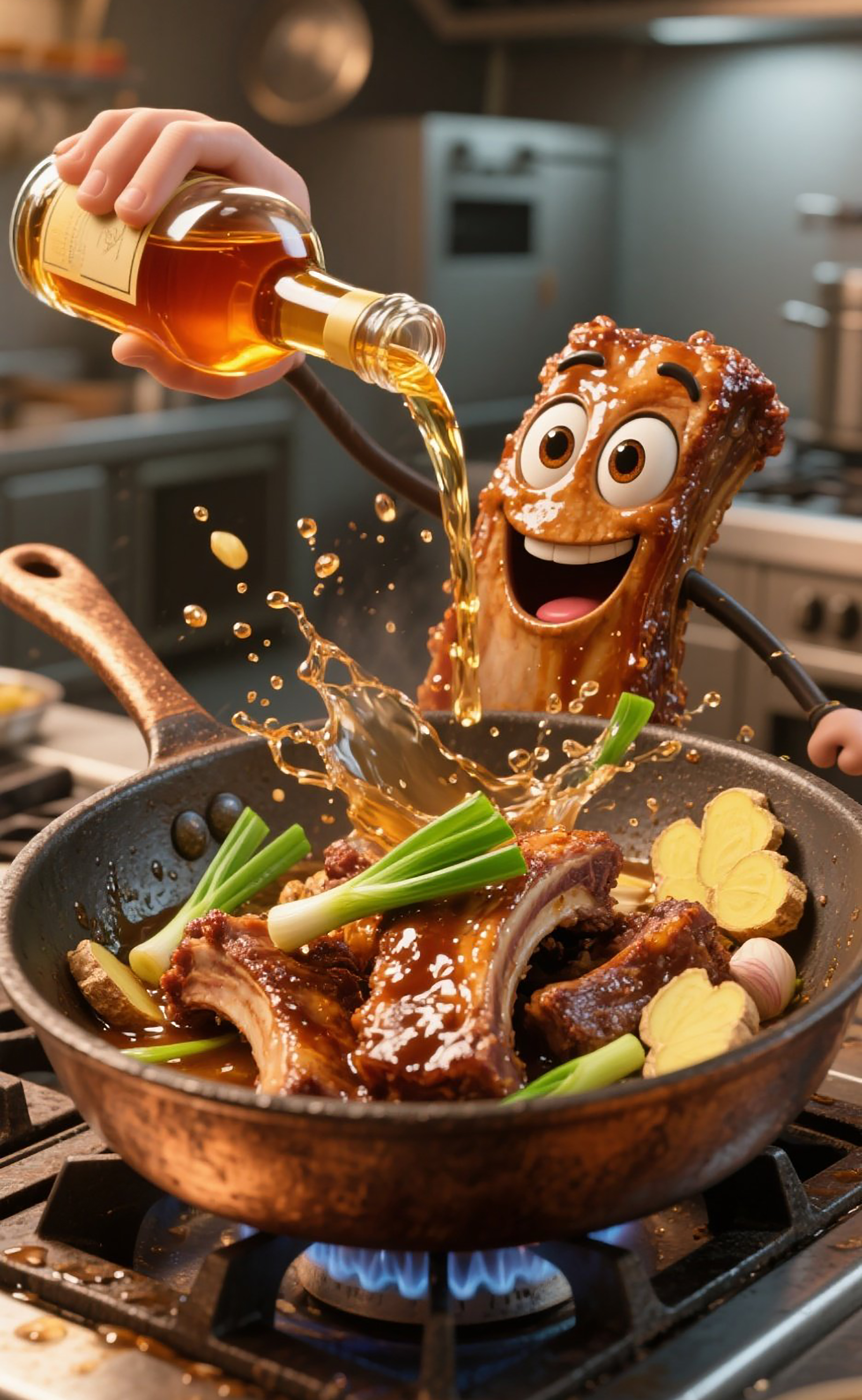 拟人化排骨站在锅旁拿着料酒往锅里倒,琥珀色酒液溅起油亮水花,翠绿葱段和金黄姜片