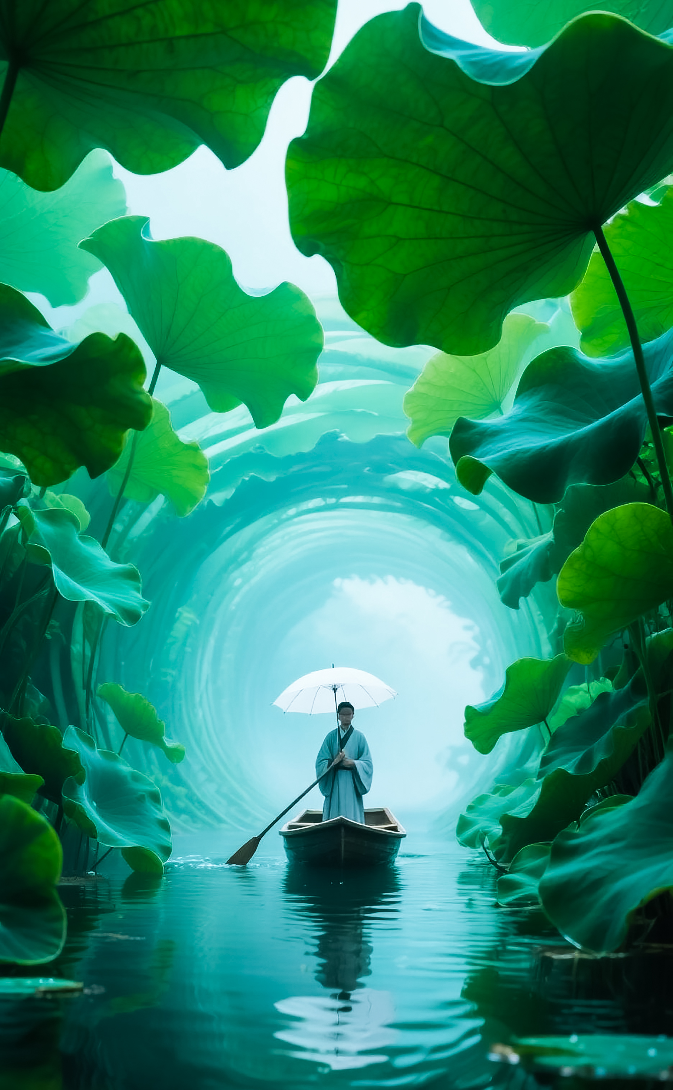 -非写实风格,梦幻主义,在一片宁静的水面上,一位渔夫,一名赶考的书生头顶白色雨伞