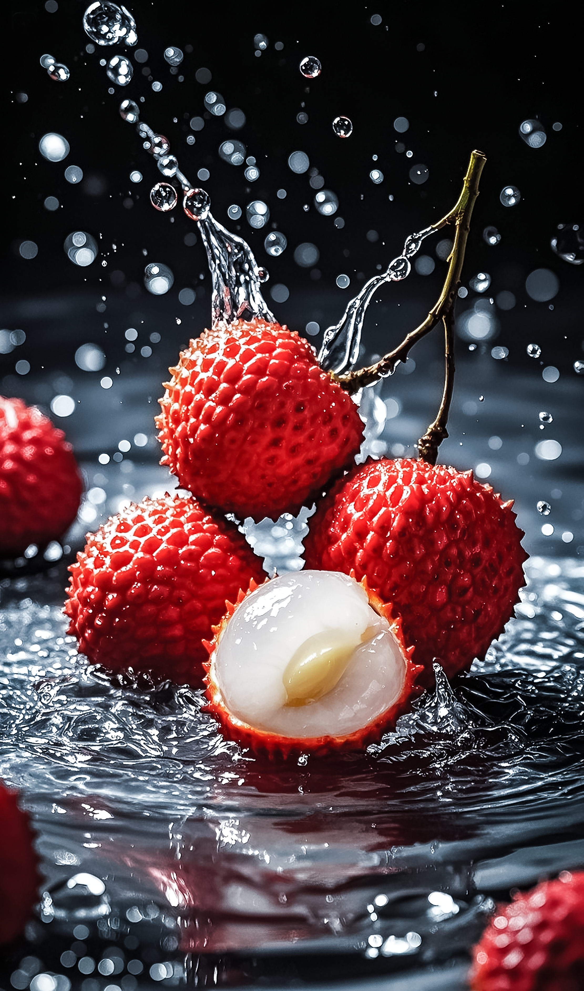 -红色的荔枝和水的摄影,黑色背景,超现实的静物摄影,微距的整个草莓,半透明的纹理