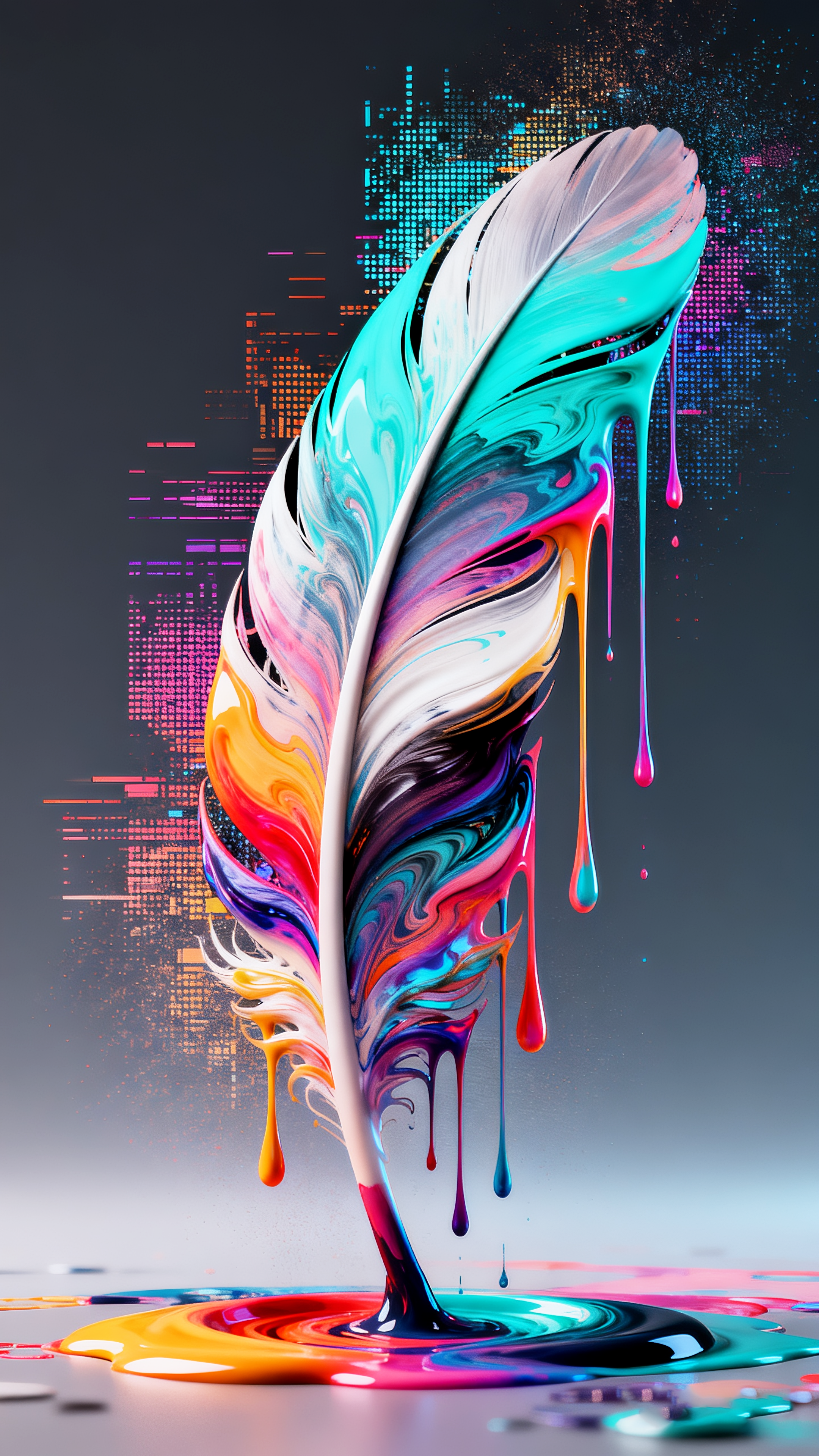 羽毛形状由流动彩墨形成,颜料侧边垂落晕染,动态美学风格,故障艺术效果,高噪点,抽象视觉冲击力,极致细节,高级感,极简设计,虚幻引擎渲染,三维立体